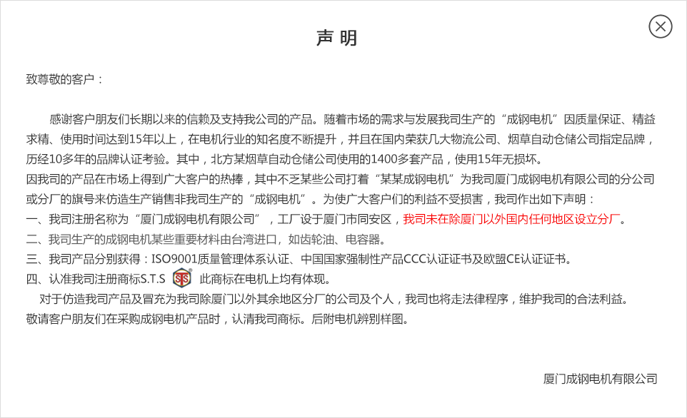公告信息:   因我司的產(chǎn)品在市場(chǎng)上得到廣大客戶的熱捧,其中不乏某些公司打著“某某成鋼電機(jī)”為我司廈門成鋼電機(jī)有限公司的分公司或分廠的旗號(hào)來仿造生產(chǎn)銷售非我司生產(chǎn)的“成鋼電機(jī)”。為使廣大客戶們的利益不受損害,我司作出如下聲明: 一、我司注冊(cè)名稱為“廈門成鋼電機(jī)有限公司”,工廠設(shè)于廈門市同安區(qū),我司未在除廈門以外國(guó)內(nèi)任何地區(qū)設(shè)立分廠。 二、我司生產(chǎn)的成鋼電機(jī)采用的齒輪、電容器、潤(rùn)滑油等均為臺(tái)灣進(jìn)口,并可提供海關(guān)報(bào)關(guān)單。 三、我司產(chǎn)品分別獲得:ISO9001質(zhì)量管理體系認(rèn)證、中國(guó)國(guó)家強(qiáng)制性產(chǎn)品CCC認(rèn)證證書及歐盟CE認(rèn)證證書。 四、認(rèn)準(zhǔn)我司注冊(cè)商標(biāo)S.T.S ???此商標(biāo)在電機(jī)上均有體現(xiàn)。 ????對(duì)于仿造我司產(chǎn)品及冒充為我司除廈門以外其余地區(qū)分廠的公司及個(gè)人,我司也將走法律程序,維護(hù)我司的合法利益。 敬請(qǐng)客戶朋友們?cè)诓少?gòu)成鋼電機(jī)產(chǎn)品時(shí),認(rèn)清我司商標(biāo)。后附電機(jī)辨別樣圖。